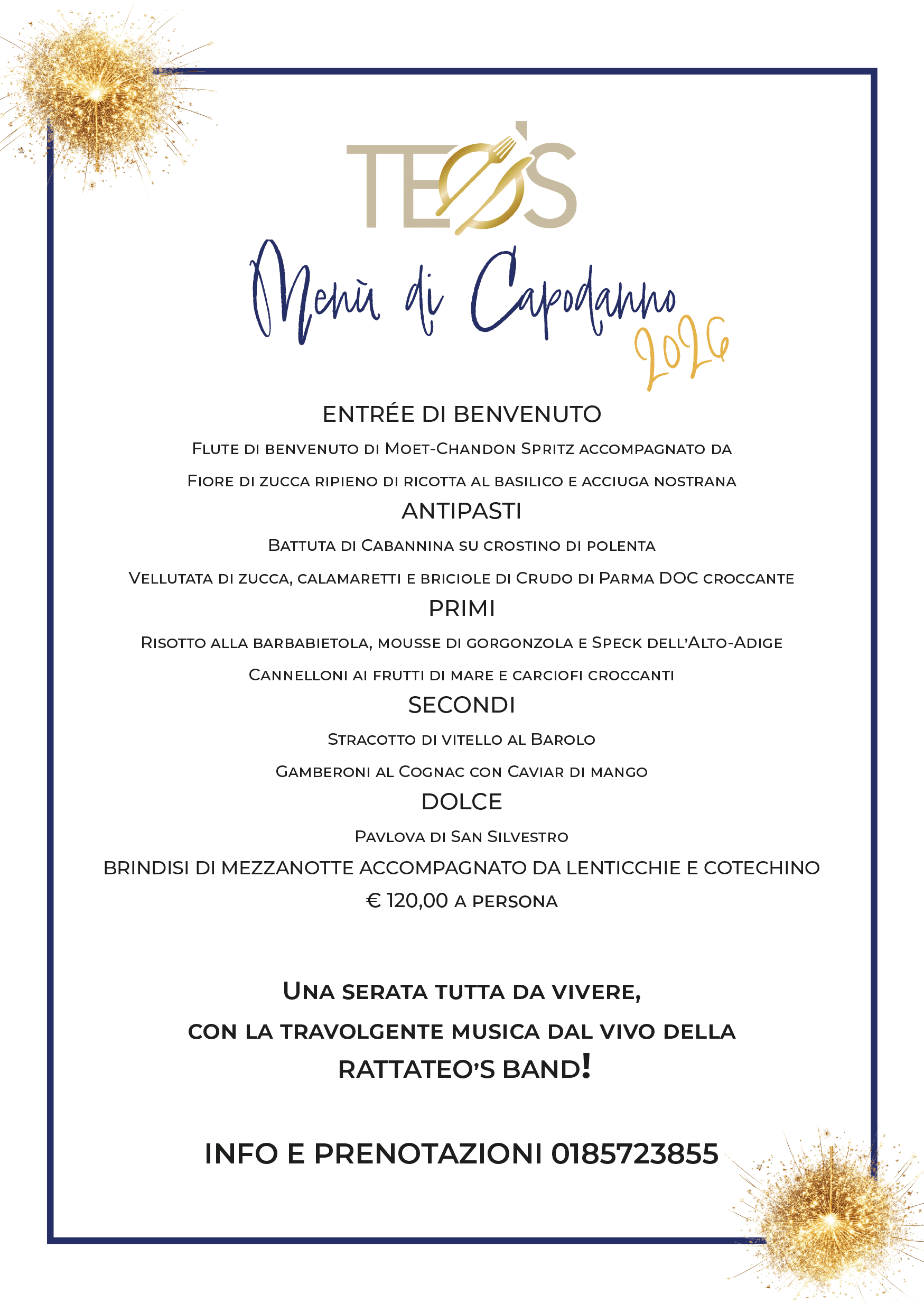 Il Menu di Capodanno Teo’s 2026 ha un costo di 120 euro a persona e comprende l’intero percorso gastronomico, il brindisi di mezzanotte e la musica dal vivo della Rattateo’s Band.